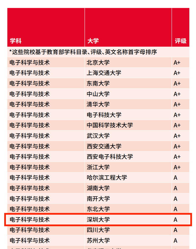In Electronics Science and Technology, 18 universities received an A+ rating, 12 universities received an A rating, and 10 universities received an A- rating. Shenzhen University's Electronics Science and Technology subject received an A rating.