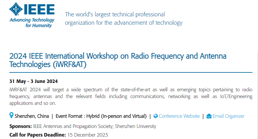 The 2024 7th IEEE International Workshop on Radio Frequency and Antenna Technologies (IEEE iWRF&AT 2024, or IEEE RFAT 2024) to be held on 31 May -3 June 2024, in Shenzhen, China. The conference is to address, explore and exchange information on the state-of-the-art in radio frequency, antennas and the relevant fields including wireless  communications, networking as well as IoT/engineering applications and so on.  We are interested in visionary, experimental, systems-related and work in-progress papers on the current state of research and emerging challenges in the radio frequency, antenna technologies and related areas. Papers should describe original, previously unpublished work, not currently under review by another conference, workshop, or journal. Accepted and orally presented papers will be submitted for inclusion into IEEE Xplore subject to meeting IEEE Xplore’s scope and quality requirements.