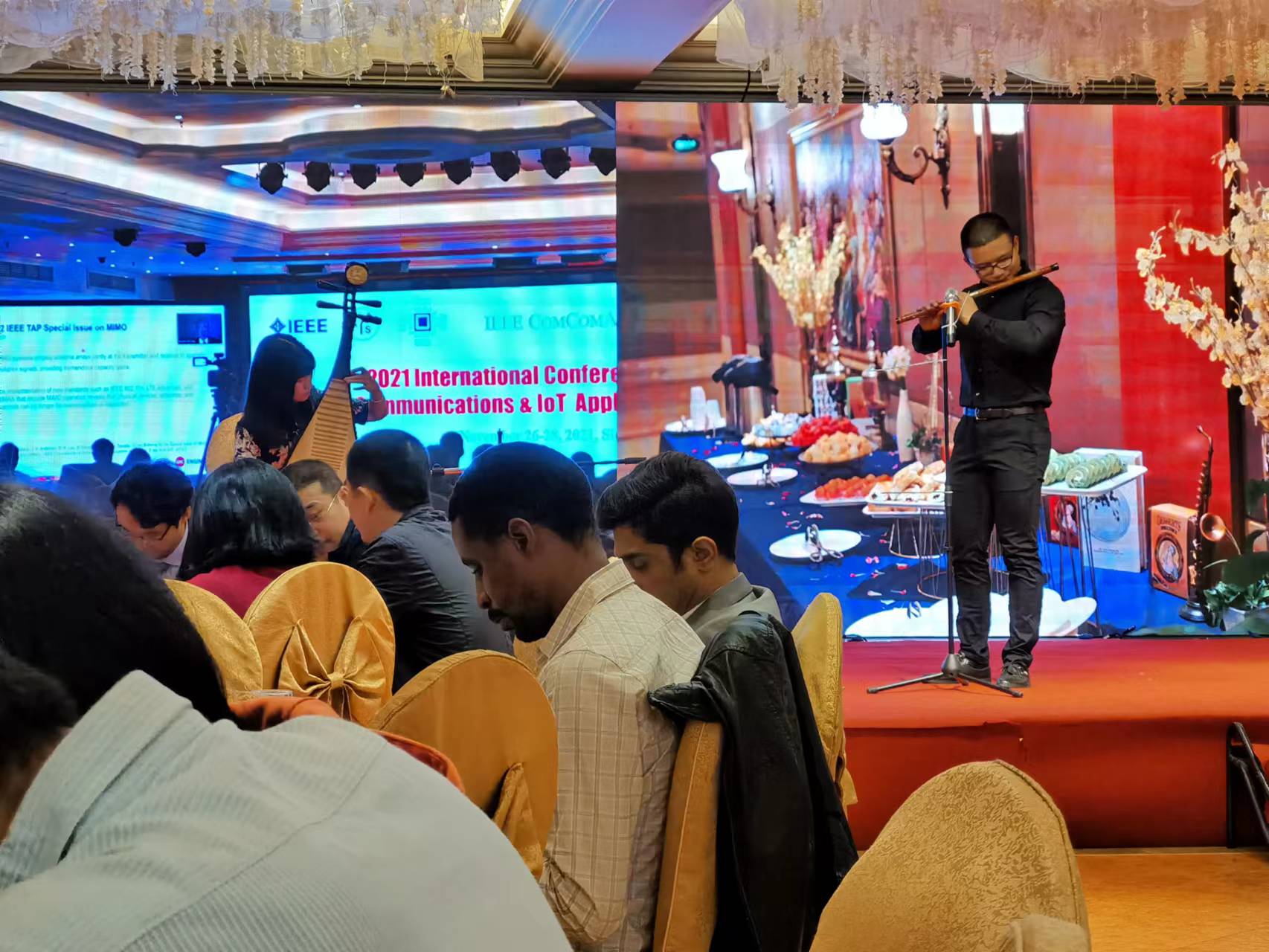 On the evening of Nov. 27 2021, the conference banquet and the awarding ceremony were held at Vienna International Hotel (Shenzhen North Station Store), Shenzhen, China. An art performance was held by the students from Southern University of Science and Technology and the banquet was enjoyed by the attendees on the the evening of Nov. 27 2021 (Figure 13). Prof. Yejun He presided over the awarding ceremony (Figure 14). There were 4 best papers presented during the conference. Figure 15 shows the photo of the best paper award winners of IEEE ComComAp 2021.