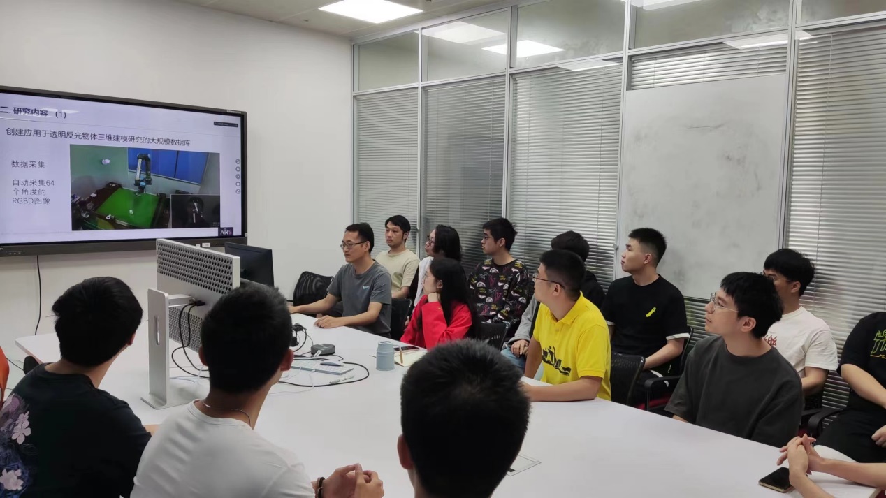 随后,支部宣传委员唐勇同志以《面对工业4.0的3D机器视觉》为主题,为大家讲解了人工智能机器视觉领域中的相关知识,主要包括三维物体视觉研究的发展背景和研究价值、三维模型大规模数据库的建立、二维图像到三维模型的重建、以及三维空间中运动物体的机械臂抓取等内容。