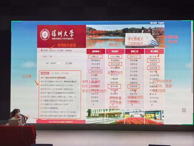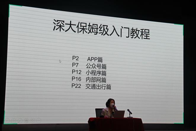导生主任张露丹向2023级新生介绍了“深大保姆级入门教程”,分APP篇、公众号篇、小程序篇、内部网篇和交通出行篇五个主要部分讲解深大校园生活,帮助新生更好适应校园。
