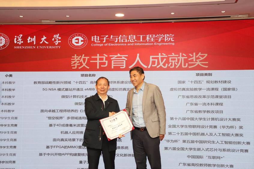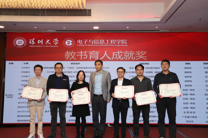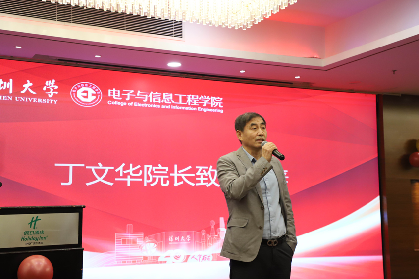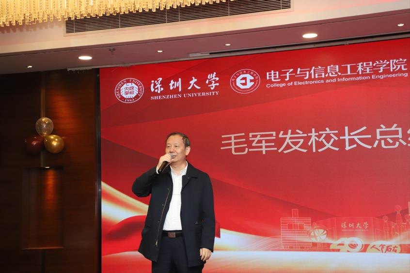 颁奖仪式结束后,在热烈的掌声中,中国科学院院士、校长毛军发做了总结讲话。毛校长简要回顾了自己从上海交通大学到深圳大学、到电子与信息工程学院的经历,感情真挚,引起全体教师的强烈共鸣,全场欢笑声、掌声不断。毛校长总结了过去一年深圳大学的发展情况,他尤其提到了2023年深圳大学的两件大事,一是获批“射频异质异构集成全国重点实验室”,二是李清泉书记成功当选中国工程院院士,实现了深圳本土高校“零的突破”,可谓是“破天荒”的大事,为深圳大学“双一流”建设打下了坚实的基础。电子与信息工程学院过去一年也是硕果累累,在教学、科研等方面成绩斐然,科研经费更是创历史新高,高达1.8亿元,位居全校前列,为新一轮学科评估冲击一流学院、一流学科打开了良好局面。毛校长鼓励大家新的一年铆足干劲、戒躁戒躁、奋发有为,为电信学院、为深圳大学做出新的更大贡献!也祝各位老师新的一年身体健康、龙马精神、龙腾虎跃!