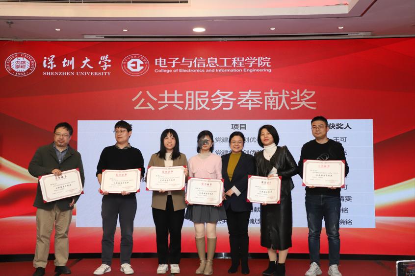 最后颁发的是“公共服务奉献奖”,“公共服务奉献奖”表彰的是过去一年来老师们在党建争优创先、公共服务、工会工作等方面做出积极奉献的老师,王可、周飞、徐珊、袁翔、彭倩雯、徐铭、林晓铭等老师获此殊荣。党委书记周浩江为获奖老师颁奖。