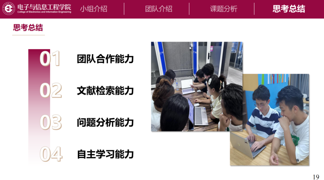 此次团队汇报是优秀团队评选和优秀营员评选的关键性环节。各组营员们为做好此次汇报,利用晚上自由活动时间积极参访学院实验室、与各科研团队志愿者、老师们深入交流。此次团队汇报中,同学们在围绕智能物联网的广泛应用与未来趋势、微波与天线技术的创新突破、单比特雷达的前沿探索、数字创意技术的无限想象,以及智能信息处理领域的智能决策与数据处理能力等热点议题,进行了详尽而富有洞见的分享,团队间彼此的分享让大家对学院具有更深刻地认识与了解。