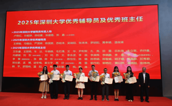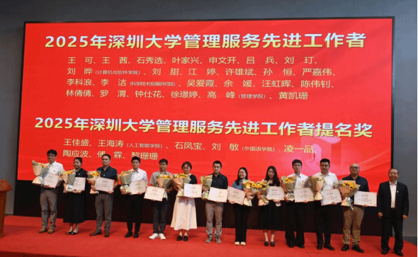 我院王可老师被评为“2025年深圳大学管理服务先进工作者”,陈柏寰老师被评为“2025年深圳大学辅导员年度人物”,温阳、李晓鹏、舒国响等3位教师被评为“2025年深圳大学优秀班主任”。