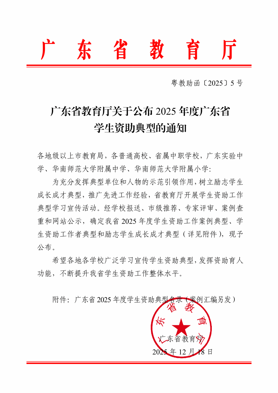 近日,省教育厅发布了《广东省教育厅关于公布2025年度广东省学生资助典型的通知》(粤教助函〔2025〕5号)文件。经学校推荐、省级评审等多环节严格遴选,我院在两项重要评选中脱颖而出,喜获佳绩!