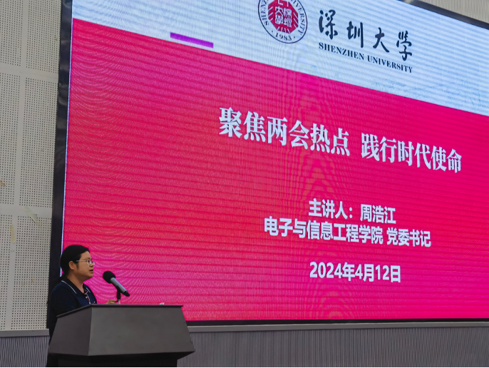 两会春风拂面来,青春繁华遍地开。为引导广大青年学生深入学习贯彻习近平总书记在全国两会期间的重要讲话精神和全国两会精神,2024年4月12日,电子与信息工程学院党委书周浩江在致腾楼一楼报告厅开讲2024年春季学期书记“思政第一课”。我院学生党员、发展对象、入党积极分子、青马“筑梦营”、学生干部等共计350人到场聆听。学院党委书记周浩江作《聚焦两会热点,践行时代使命》的主题授课。