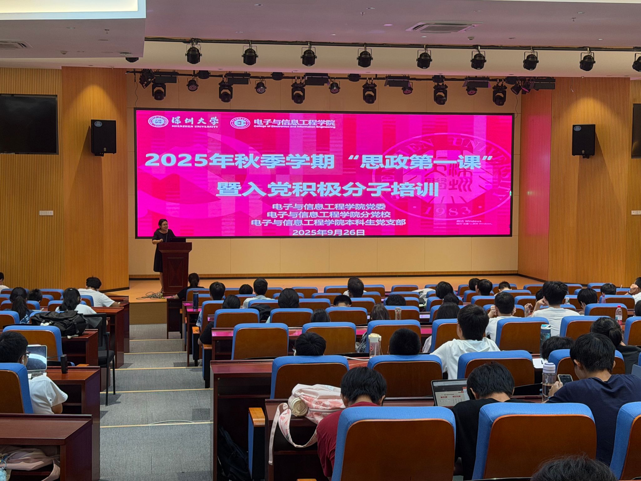 为深入学习宣传贯彻习近平新时代中国特色社会主义思想,做好青年学生的思想教育工作,9月26日,电子与信息工程学院党委与团委在致信楼N107会议室联合举办新学期的第一场融合式“大思政课”——“思政第一课”、入党积极分子培训、“青马先锋团·筑梦营”集中学习、学生干部培训。