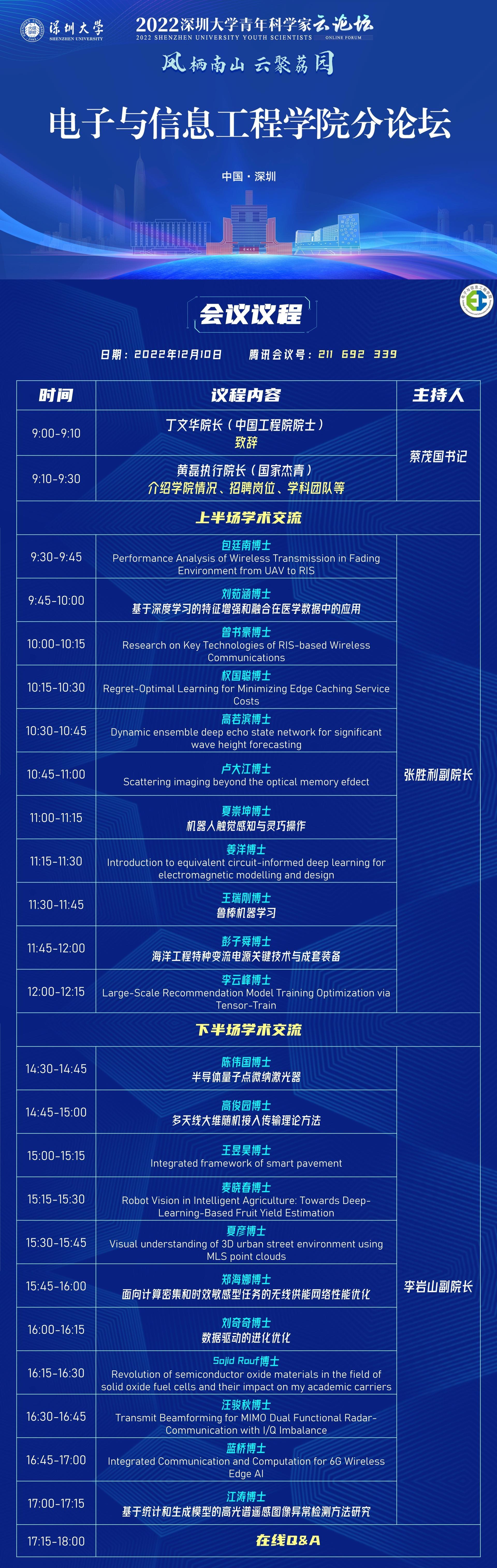 为提升学院学科品牌与影响力,加大海内外青年才俊引进力度,12月10日,我院顺利举办了深圳大学电子与信息工程学院青年科学家分论坛。论坛邀请了22位海内外青年学者作学术报告,在线观看人数达200人。