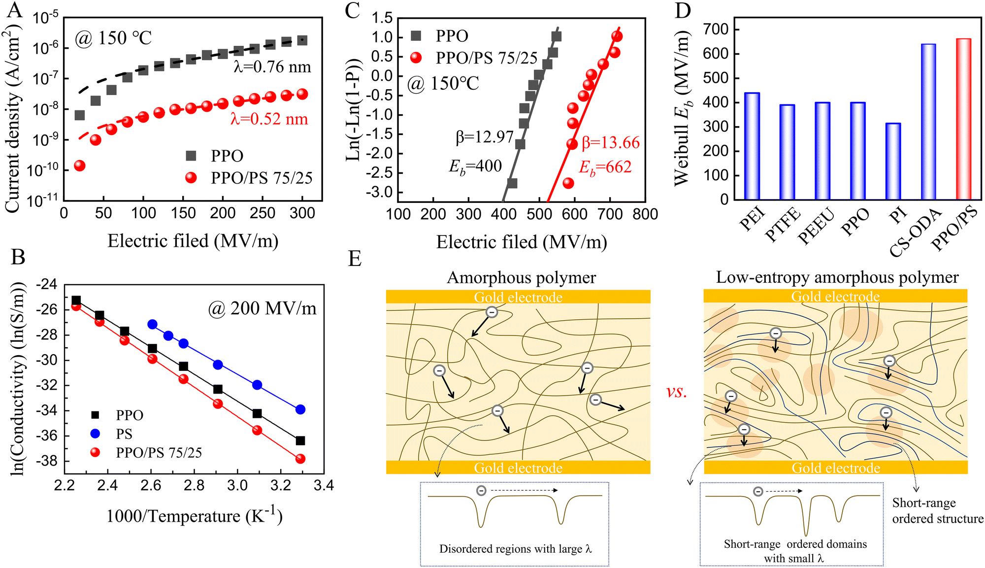 该研究是在前期工作基础上(Matter,2021,4(7):2448-2459)进行的深入拓展,旨在解决薄膜电容器在高温下漏电流急剧提升的核心科学问题。研究提出了一种低熵非晶态聚合物构筑策略。该低熵非晶态聚合物由高玻璃化转变温度的聚(2,6-二甲基-1,4-苯撑氧化物)(PPO)和聚苯乙烯(PS)分子级共混而成,在高温和高电场下表现出优异的电容性能。材料设计原理是利用PS的苯环与PPO的苯环之间的强范德华力,在分子水平上“拉伸”主链,从而显著降低非晶态聚合物的分子构象熵,形成随机取向但高度紧密堆积的延展聚合物链,通过深能级局部态抑制电荷传输。研究结果表明,该低熵非晶态介电聚合物在150℃下表现出5.5 J/cm³的放电能量密度和超过90%的充放电效率,性能优于现有的介电聚合物,并显示出放电能量密度的两倍以上的提升。此外,与其他方法相比,该薄膜加工工艺(即聚合物共混)更简单、直接且成本低,因此该方法为高性能和高质量聚合物薄膜的量产铺平了道路,这些薄膜在高温薄膜电容器中具有广泛应用。