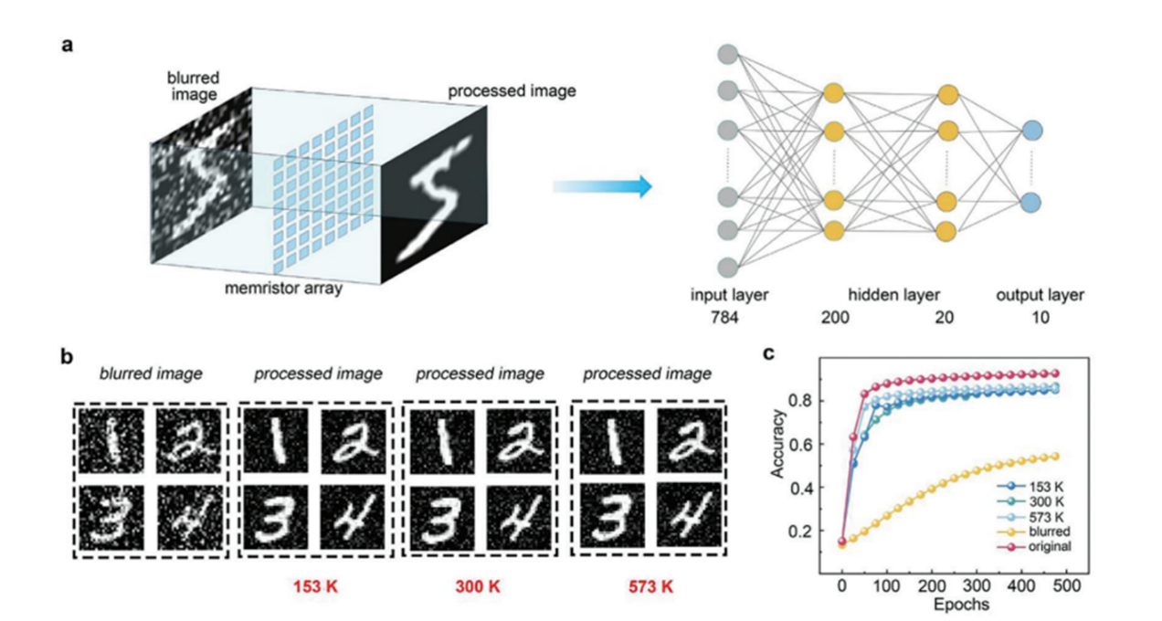 利用忆阻器的阈值开关特性对模糊图像进行去噪:经过器件阵列滤波后不仅显著提高了模糊图像的清晰度,并提高了后续人工神经中图像识别任务的准确率(从54.37%提升到了92.78%)。在不同温度的影响下(153k、300k和573k),使用该系统对图像进行去噪后,准确率都能提高到85%以上。这些结果表明,该忆阻器有在极端温度环境下执行神经形态类脑计算的潜力。