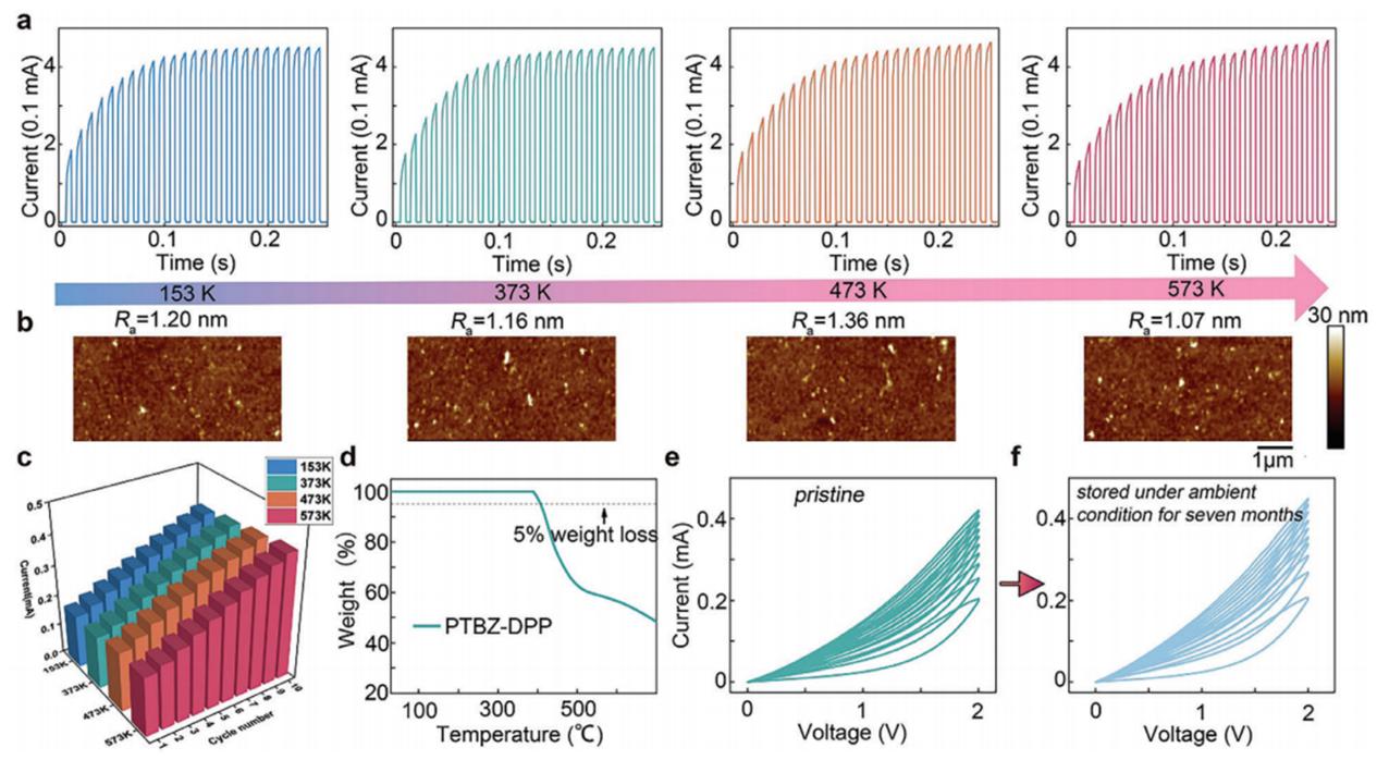 图2. PTBZ-DPP忆阻器的温度和环境稳定性测试。