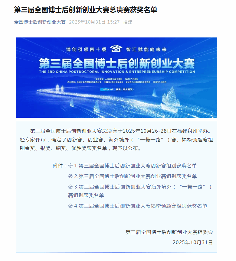 团队立足大湾区的科技发展战略,精准对接产业需求,以硬核技术实力在全国赛事中脱颖而出,不仅为学院赢得了荣誉,更向行业展现了我院博士后队伍服务区域科技创新的责任与担当。未来,学院将持续优化人才培养生态,鼓励博士后群体勇攀科研高峰、投身创新创业实践,为大湾区科技自立自强与高质量发展注入更强劲的人才力量!