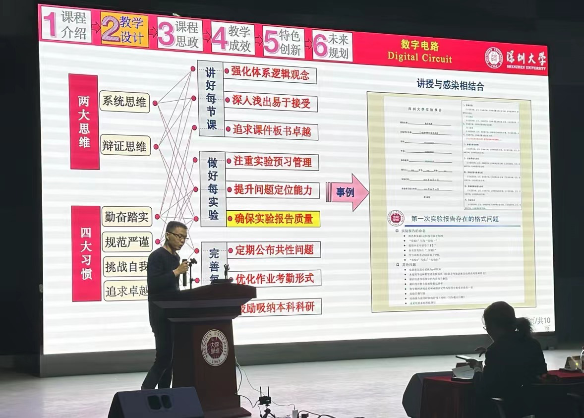 张志朋老师首先阐述了自己的教学理念:教学是一个良心活也是一个技术活,以教育心理学和行为心理学为理论指导,设计以学生为中心的高质量活跃课堂,同时注重知识传授和价值引领相结合;简述了《电子电路》在课程体系中的地位,进行了学情分析,以案例教学的形式开展了教学设计,突出了以“项目教学法推进实验课程改革”和“信息化赋能课堂改革”的创新特色,汇报了该门课的教学成效。