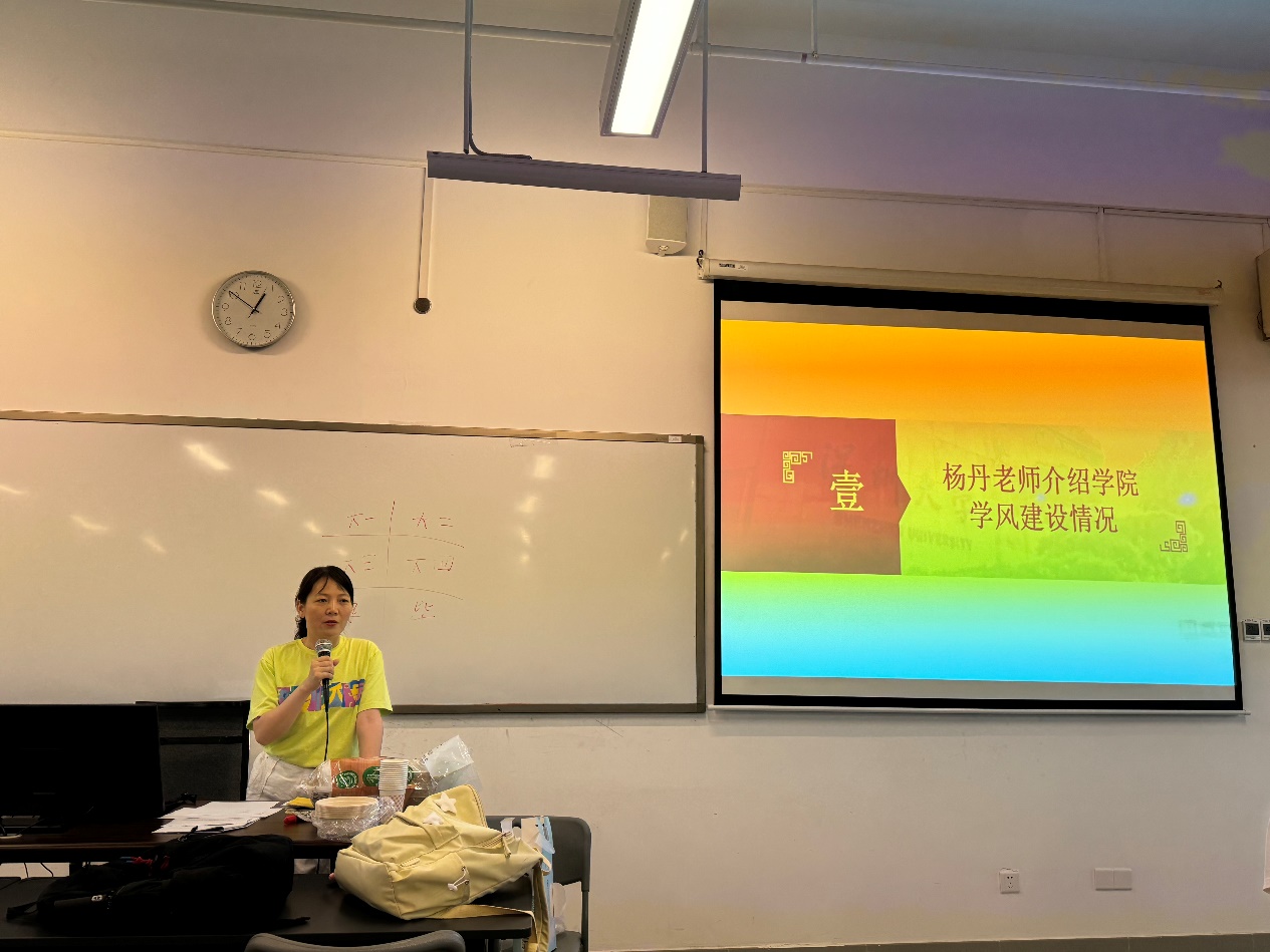 会议首先由杨丹老师介绍学院学风建设情况。她着重强调了良好学风对学生学业发展的积极推动作用,并介绍了学院在学风建设方面的具体安排和措施。她提到,一流的学风是学校建设世界一流大学的必要条件,近年来学院科研水平和学科发展势头强劲,同学们要与学院发展同频共振,明确个人发展目标,在思想上和行动上,把学业视为第一要务。杨丹老师还结合自身经历分享了她在大学时期的学习生活,以此鼓励同学们积极追求健康向上的大学生活,不断提升自我,实现全面发展。