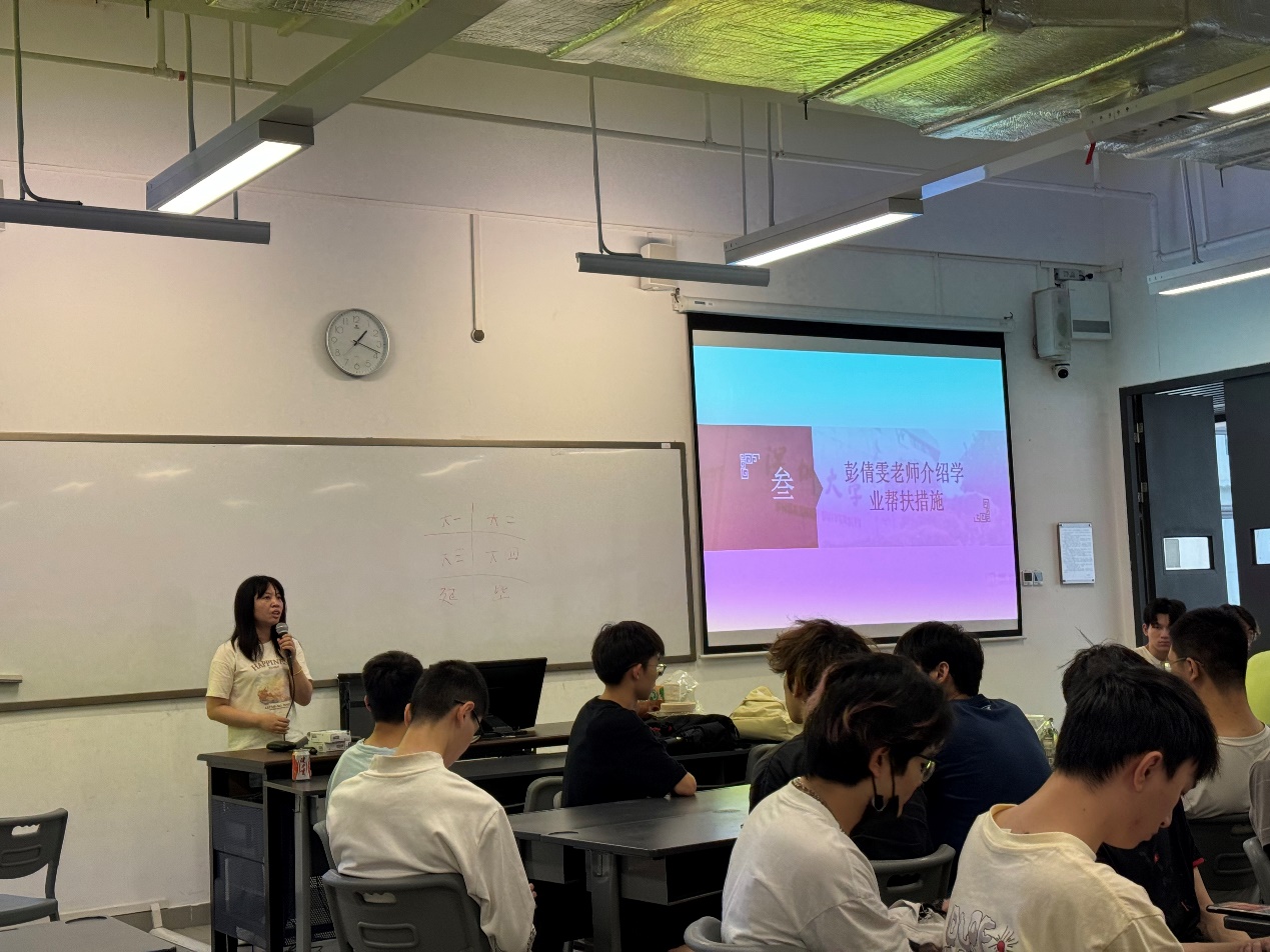 辅导员彭倩雯老师分享了学业帮扶措施,让同学们更有信心克服学业困难,实现学业目标。彭老师也请同学们现场扫码填写问卷,表示会根据同学们的需求举办各类活动:如,开展职业规划讲座、职业规划师咨询、学习经验分享、提供个性辅导、组织学习互助小组等等。