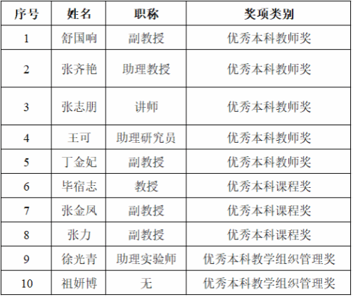 在深圳大学2023-2024学年度本科教学单项奖评选工作中,我院舒国响等5位教师荣获优秀本科教师奖,毕宿志等3位教师荣获优秀本科课程奖,徐光青等2位教师荣获优秀本科教学组织管理奖。