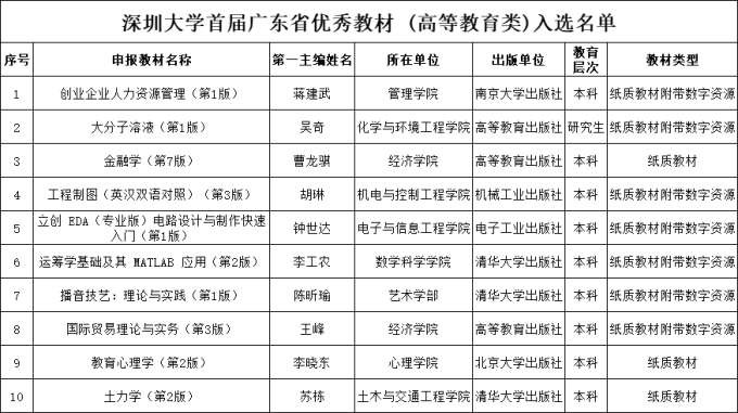 经教材负责人申报、培养单位初审、研究生院组织专家评审推荐等环节,我院共有2本教材获深圳大学2025年研究生优秀教材建设项目资助。