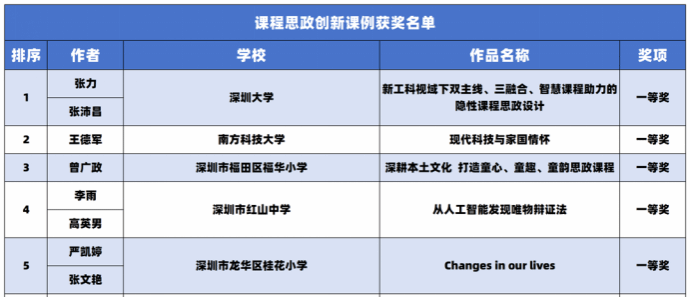 在深圳市教育局组织开展的深圳市第四届思政课改革创新系列优秀成果暨思政“金课”征集活动中,我院张力老师和张沛昌老师的《新工科视域下双主线、三融合、智慧课程助力的隐性课程思政设计》荣获课程思政创新课例一等奖。
