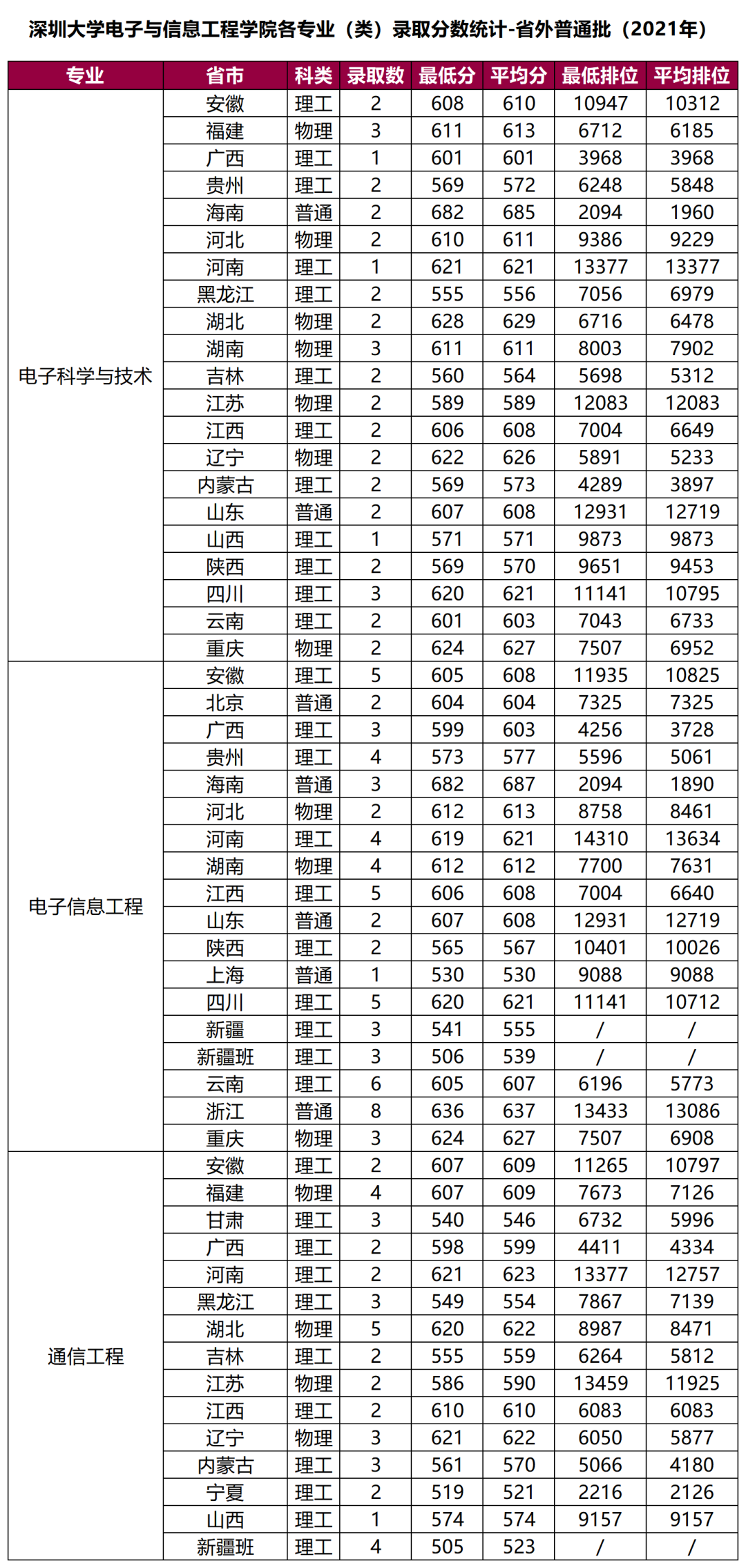 学院现有信息与通信工程、电子科学与技术两个一级学科;拥有两个博士点:信息与通信工程一级学科博士点和电子信息专业博士点;信息与通信工程博士后流动站1个。学院拥有信息与通信工程、电子科学与技术2个一级学科学术型硕士点,新一代电子信息技术、通信工程、集成电路工程3个专业型硕士点;设有电子信息工程、通信工程、电子科学与技术、微电子科学与工程4个本科专业。信息与通信工程学科是深圳大学最早(2006年)的三个博士点之一,属于广东省攀峰重点学科(省内最高级别),广东省高水平大学建设重点学科(首批),广东省“冲补强”重点学科(建设期评估A+)。在全国第四轮学科评估中,信息与通信工程学科在广东省排名第二,并列全国28位;在软科中国最好学科排名中,信息与通信工程学科2020年位居全国13名,2021年位居全国14名,省内均排名第二。深圳大学工程学是深圳市第一个ESI全球排名前1‰的学科,本学院贡献排名第一,深圳大学计算机科学进入ESI全球排名前1.01‰的学科,本学院贡献排名第二。电子信息工程专业、通信工程专业已成功入选教育部“双万计划”国家一流本科专业建设点;通信工程专业入选广东省特色专业,电子信息工程专业获批广东省首批一流本科专业,微电子科学与工程专业获批广东省一流本科专业建设点。