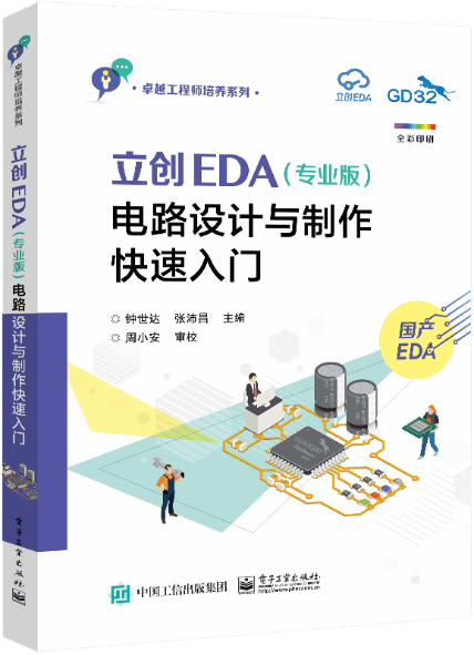 《立创EDA(专业版)电路设计与制作快速入门》(钟世达、张沛昌主编;ISBN:978-7-121-42696-4),2022年2月由电子工业出版社出版。据电子工业出版社统计,截至到今年7月,该教材目前共发行20200册。据不完全统计,使用该教材的有深圳大学、华中科技大学、苏州大学、华东师范大学、南京工业大学、青岛科技大学、青岛理工大学、桂林理工大学、石河子大学、塔里木大学、广东海洋大学、深圳职业技术大学、苏州市职业大学、九江学院等超过100所学校。该教材自出版以来,在全国得到了广泛的应用,获得广大师生的好评,该教材配套的线上教学视频播放量已突破58万次。除了高校外,该教材也受到相关行业工程技术人员欢迎,被部分公司用于培训电路设计与制作相关岗位人员。目前该教材已被嘉立创公司推荐为官方EDA软件学习教材。