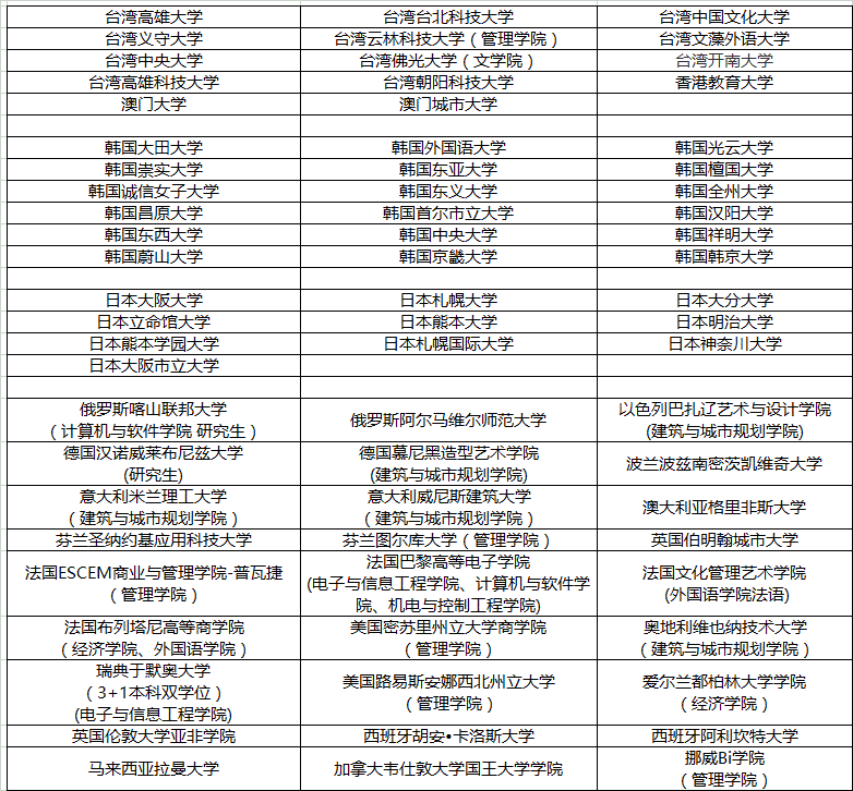 遍及亚洲区,美洲区,欧洲区,大洋洲区众多著名大学包括美国哥伦比亚大学,宾夕法尼亚大学,加州大学伯克利分校,加拿大麦吉尔大学,多伦多大学,澳大利亚悉尼大学,西澳大学,日本早稻田大学,韩国汉阳大学,英国牛津大学,剑桥大学,德国海德堡大学,中东欧五国大学,新加坡国立大学,香港大学和台湾中国文化大学等等 注:每年寒暑假安排部分院校,以每季度发布的校内公文通为准。