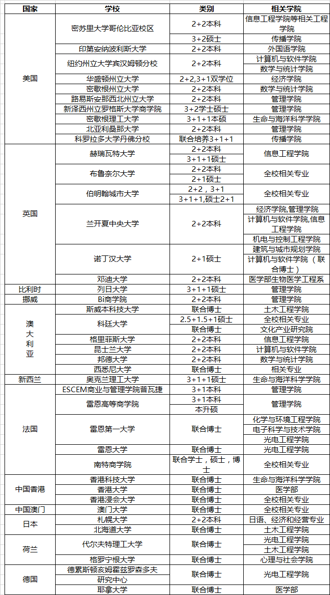 我校携手境外高校开展本科和研究生联合培养的双学士、双硕士项目(主要模式为2+2、3+1,2+1)、参与该项目的学生只要能顺利完成境外高校的学业,就可获得本校和外方院校两个学位;另外还有本硕直读和联合博士项目。