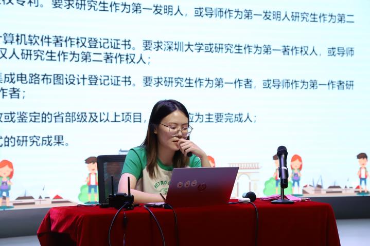 导生主任张露丹向2023级新生介绍了“深大保姆级入门教程”,分APP篇、公众号篇、小程序篇、内部网篇和交通出行篇五个主要部分讲解深大校园生活,帮助新生更好适应校园。