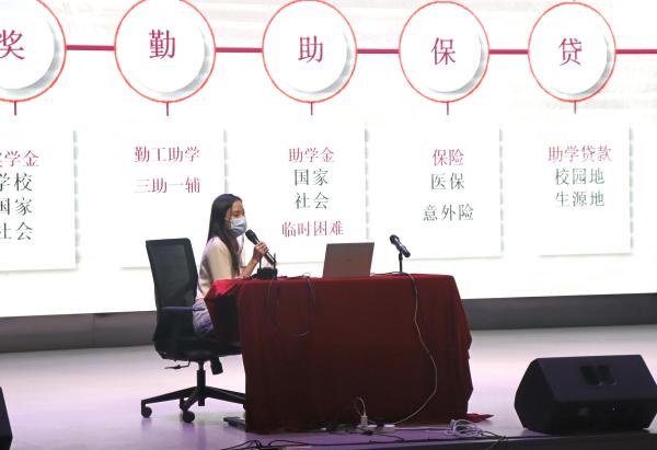 叶可慧老师为新生们讲解了本科生奖学金的评选方法。曾铭然老师为新生们讲述了本科生助学金、贷款及医保的缴纳。王悦力老师介绍了研究生奖助学金体系及荔研优学的评选条件。吴发强老师主要为新生们讲解了勤工俭学奖的具体内容。校级、院级以及社会奖学金的颁发激励着同学们用知识创造财富,用创新打造奇迹;助学金使得热爱学习、渴望知识与进步的同学们无需担忧财务困难,只管大步迈向星辰大海。