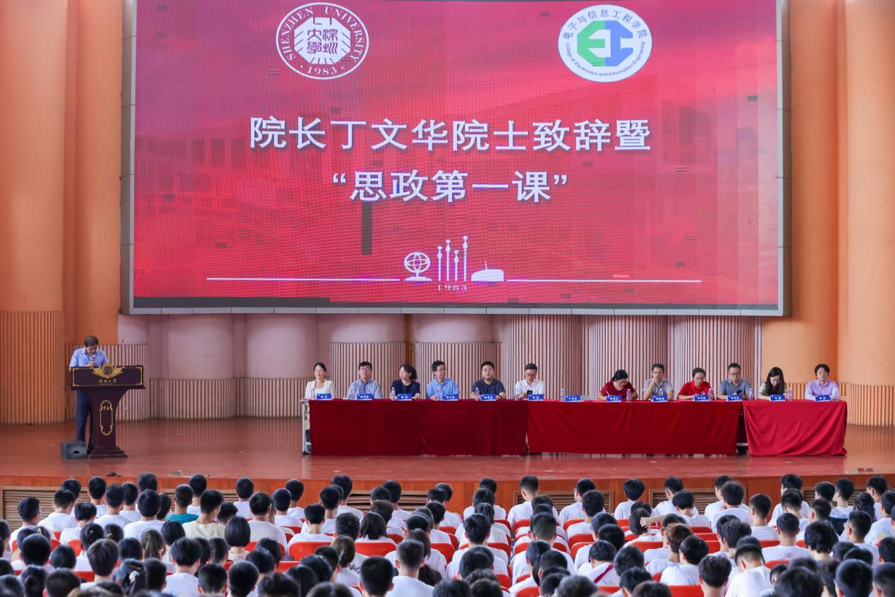 9月3日下午,电子与信息工程学院2024级新生开学典礼暨秋季学期“思政第一课”在深圳大学粤海校区演会中心隆重举行,院长丁文华院士、党委书记周浩江、执行院长黄磊、副院长张沛昌、各系主任、教师代表、新生班主任代表、辅导员及2024级电子与信息工程学院一千余名新生齐聚一堂,参加开学典礼。本次开学典礼由学院党委副书记杨丹主持。