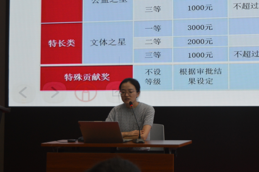 叶可慧老师为新生们介绍了本科生奖学金的评选标准,包括学习成绩、综合素质、社会实践、科研创新等多个方面,鼓励同学们全面发展,不仅要在学业上追求卓越,更要注重培养自己的综合素质和创新能力。鼓励新生们积极参与各类竞赛、科研和社会实践活动,努力提升自己的综合素质和竞争力,争取获得这些宝贵的荣誉和资助。