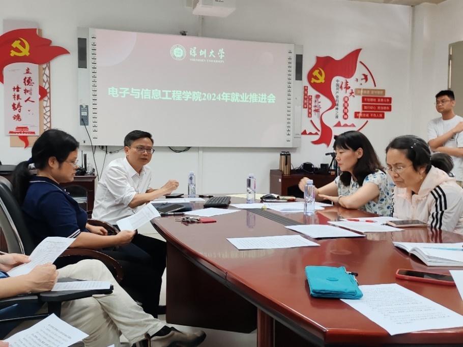为进一步落实就业工作,促进2024届毕业生高质量充分就业,深圳大学电子与信息工程学院于4月12日中午在沧海校区致信楼N723召开2024年就业推进会。执行院长黄磊、党委书记周浩江、各系主任、班导师、研究生导师代表、毕业班辅导员及就业联络专员参加了会议,会议由学院党委副书记杨丹主持。