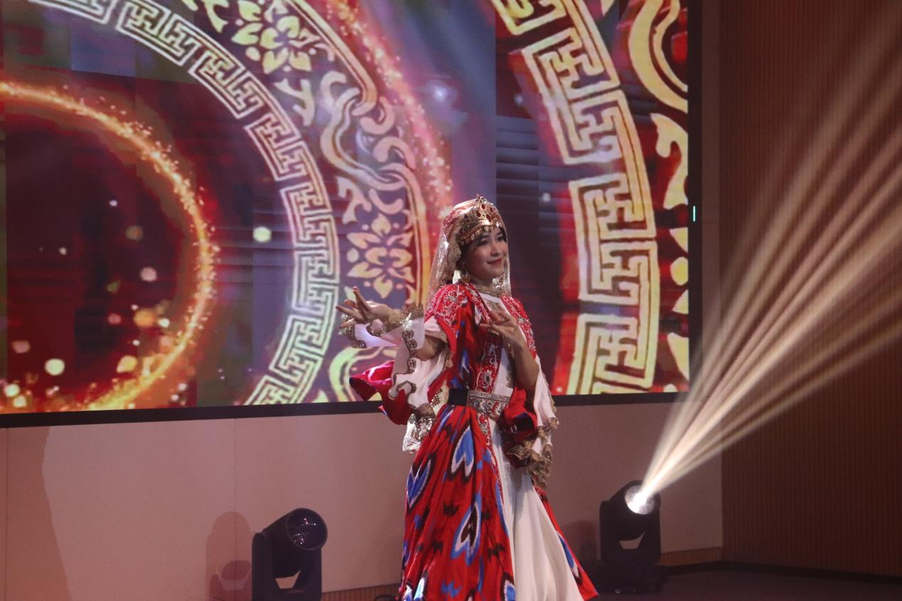 其中颇有亮点的是《舞动疆彩》,由来自新疆的2024级电子信息类06班的孜丽努尔同学出演。她身着新疆民族服装,在舞台上展示来自西北的绮丽舞蹈,充分展现了民族风情,赢得了台下观众阵阵掌声,将晚会推至最高潮。