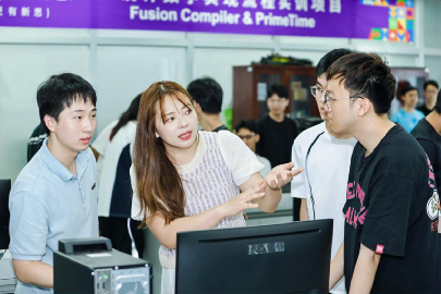 上机实操环节,在工程师的现场指导下,学生们分组动手实践,利用Fusion Compiler和PrimeTime工具链,在真实的工业级设计环境和示例项目上,演练了所学的物理实现流程、时序分析、功耗优化等关键技术。工程师们深入探讨了学生们在实操中遇到的数字集成电路中后端设计常见挑战,并提供了即时的解决方案和优化建议。特别是在AI和高性能计算领域,芯片设计的复杂性和性能要求越来越高,工程师们结合实例分享了应对这些挑战的策略。