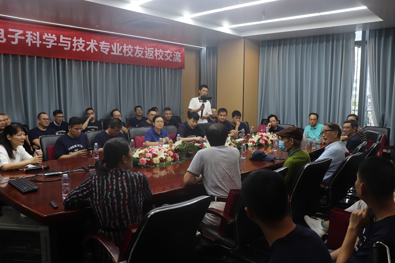 师生座谈会上由电子与信息工程学院党委副书记杨丹主持,她对各位师生的到来表示欢迎,并介绍了出席座谈会的各位老师和领导。电子与信息工程学院党委书记周浩江致辞,她对回校的校友表示热烈欢迎,向阔别深大二十载的校友们介绍了学院美好的发展前景、学科建设和师资队伍情况,对参加返校活动的老师和校友们表示衷心感谢和美好祝福。