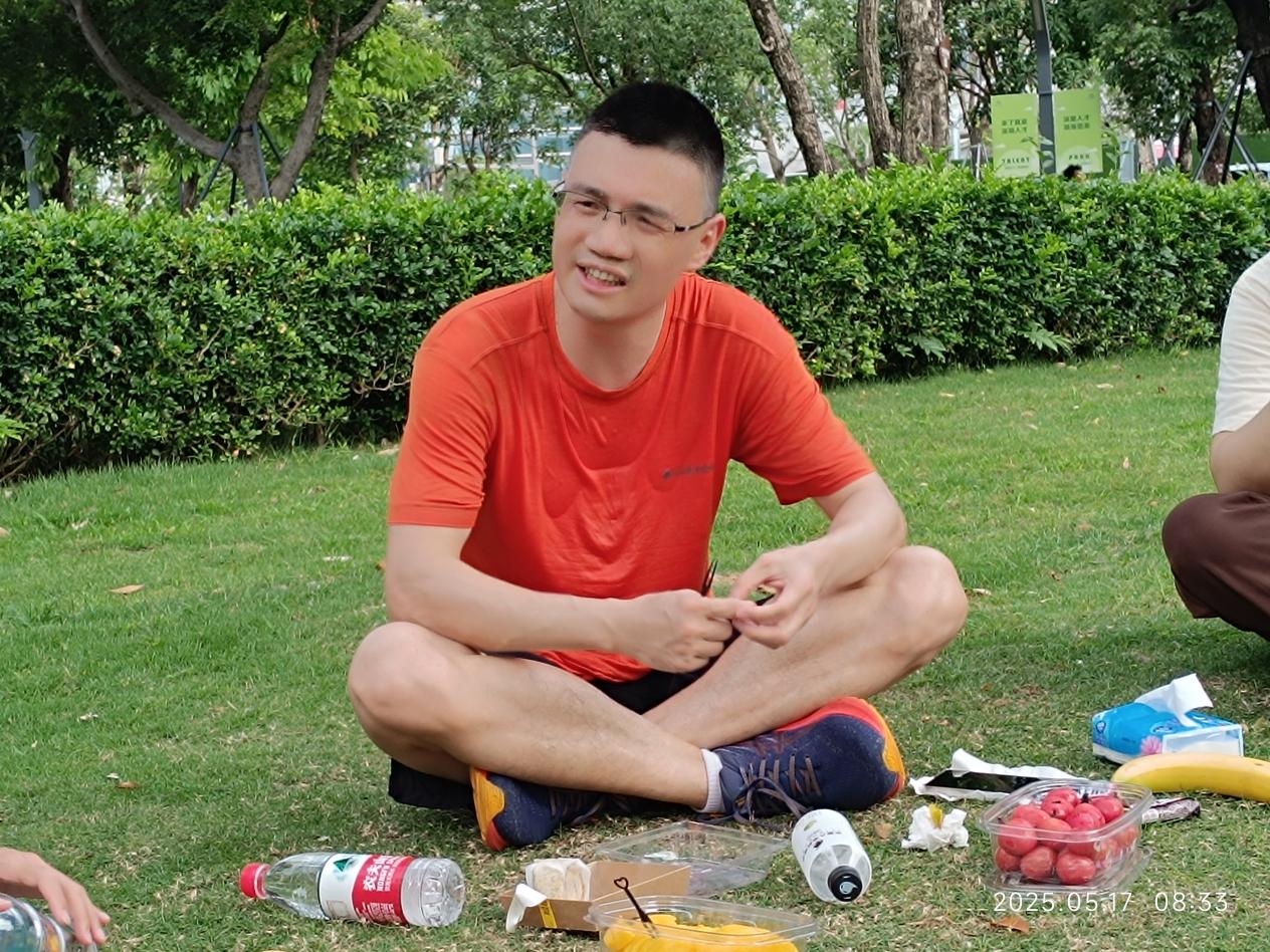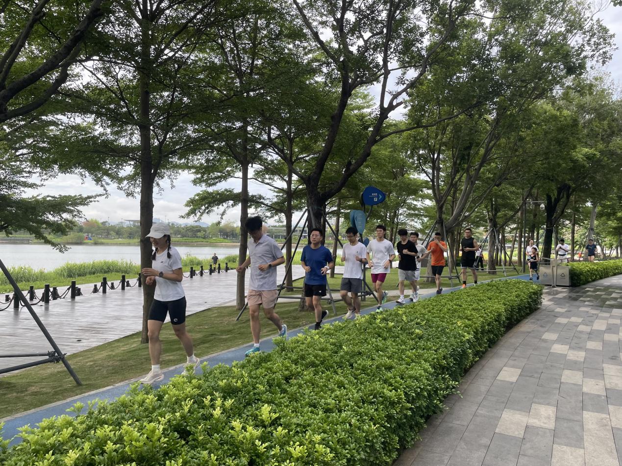 活动伊始,在跑团教练蒋卓航同学的带领下,全体参与者进行了跑前热身活动,包括现场指导跑姿调整与呼吸节奏控制,帮助参与者掌握科学跑步方法。队伍沿人才公园湖滨绿道开启了约5公里的晨跑,途中由2025清远马拉松高校女子组亚军伍素琳同学分段领跑并实时提示配速。