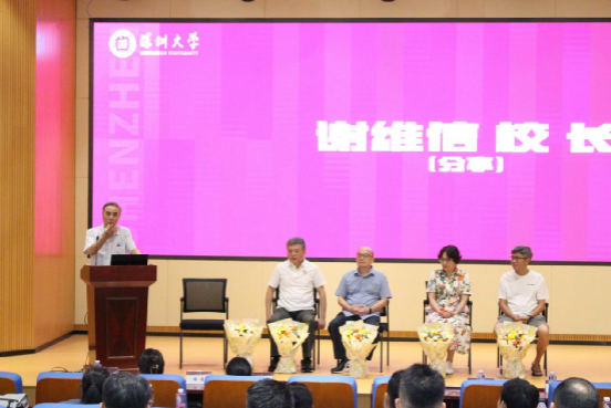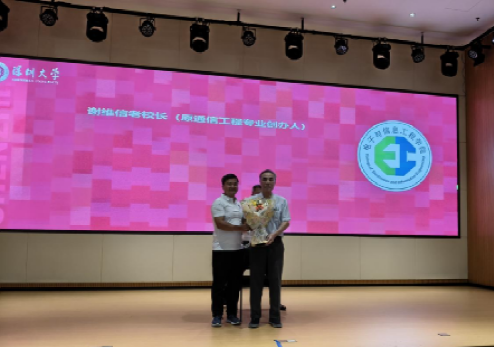 随后,老师们次第登台,在笑语中重温青葱岁月。谢维信老校长率先发言,从1997年信息工程学院初创的艰辛,讲到如今学科体系的完善,尤其提及01级作为通信工程专业首批学生的特殊意义。他笑谈深大图书馆南北相望的布局,称其间小径如“智慧金钥匙”,指引学子探索求知;更阐释了学院与深圳同频共振的发展愿景,最后以“愿君前程似锦,与年轻一代并肩前行”的寄语收尾,温情满溢。