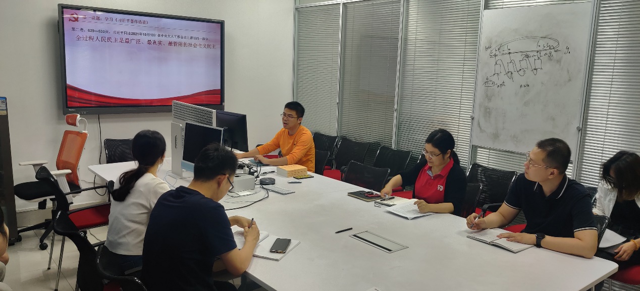会议伊始,周飞领学第一议题,他带领大家学习了《习近平著作选读》,重点学习了全过程人民民主中过程民主、成果民主、程序民主、实质民主等重要含义,介绍了全过程人民民主在选举和协商两方面的优势。同时,周飞向各位党员介绍了开展学习贯彻习近平新时代中国特色社会主义思想主题教育的后续活动方案,力争从理论学习、调查研究、推动发展等多个方面落实展开。