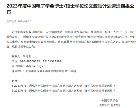 中国电子学会(Chinese Institute of Electronics)成立于1962年,是5A级全国学术类社会团体,具有47个专业分会,覆盖了半导体、通信、微波、信号处理、电子材料等电子信息科学技术的所有领域。中国电子学会开展优秀博士/硕士学位论文评价工作旨在贯彻落实新时代人才强国战略,服务科技强国建设,充分发挥学会发现人才、培养人才、举荐人才的作用,推动电子信息领域的技术进步与创新,促进青年人才成长,壮大学会的会员队伍。